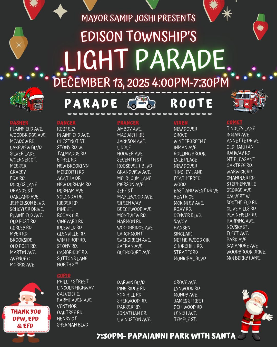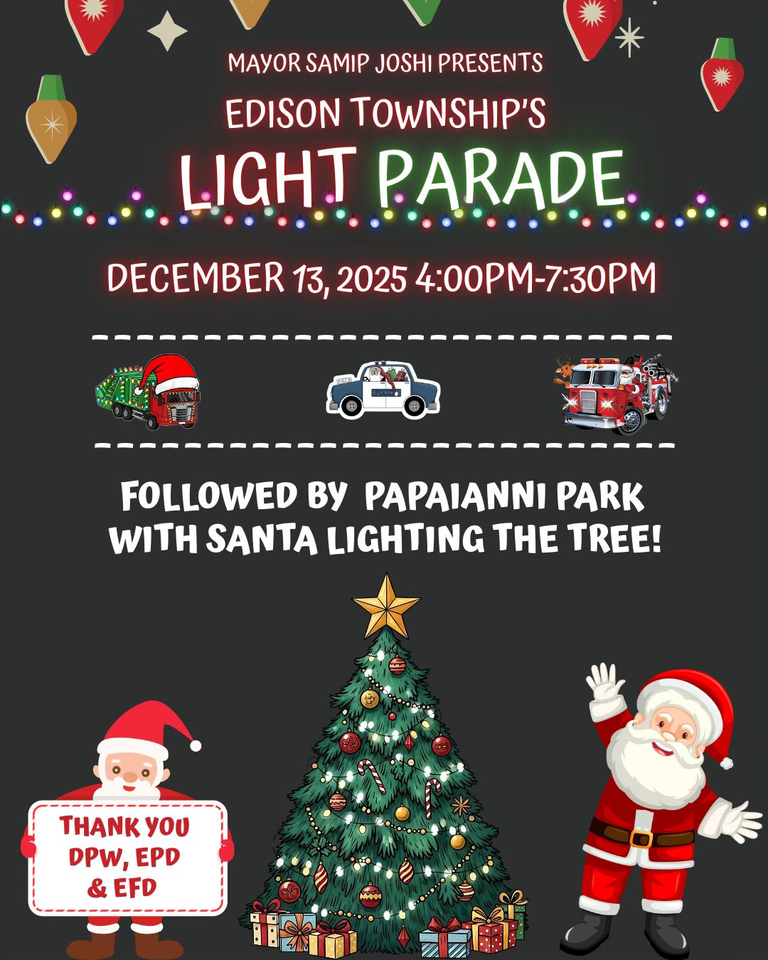 2025-December-13, Saturday @ 04:30 PM - Edison Light Parade and Tree Lighting