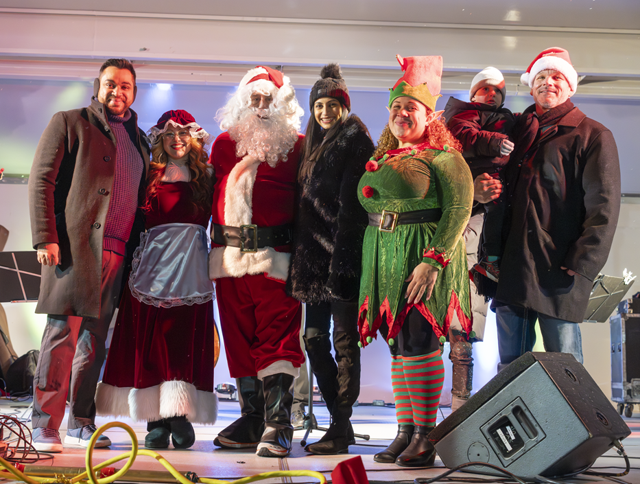 On stage with the Mayor and my Grandson after Santa light the tree, and then in front of the tree.